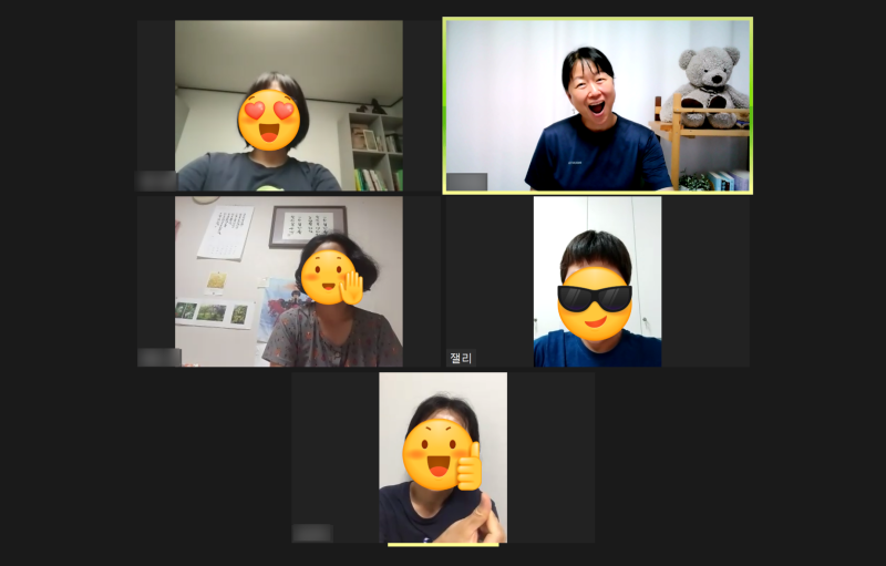 보통 서너 명이 모이지만 모일 때마다 부담스럽지 않아 즐겁고 편안합니다. 영어 표현이 생각나지 않고 급할 때는 한국어만 섞어 씁니다. 그때 우리는 모두 웃음을 터뜨렸습니다.