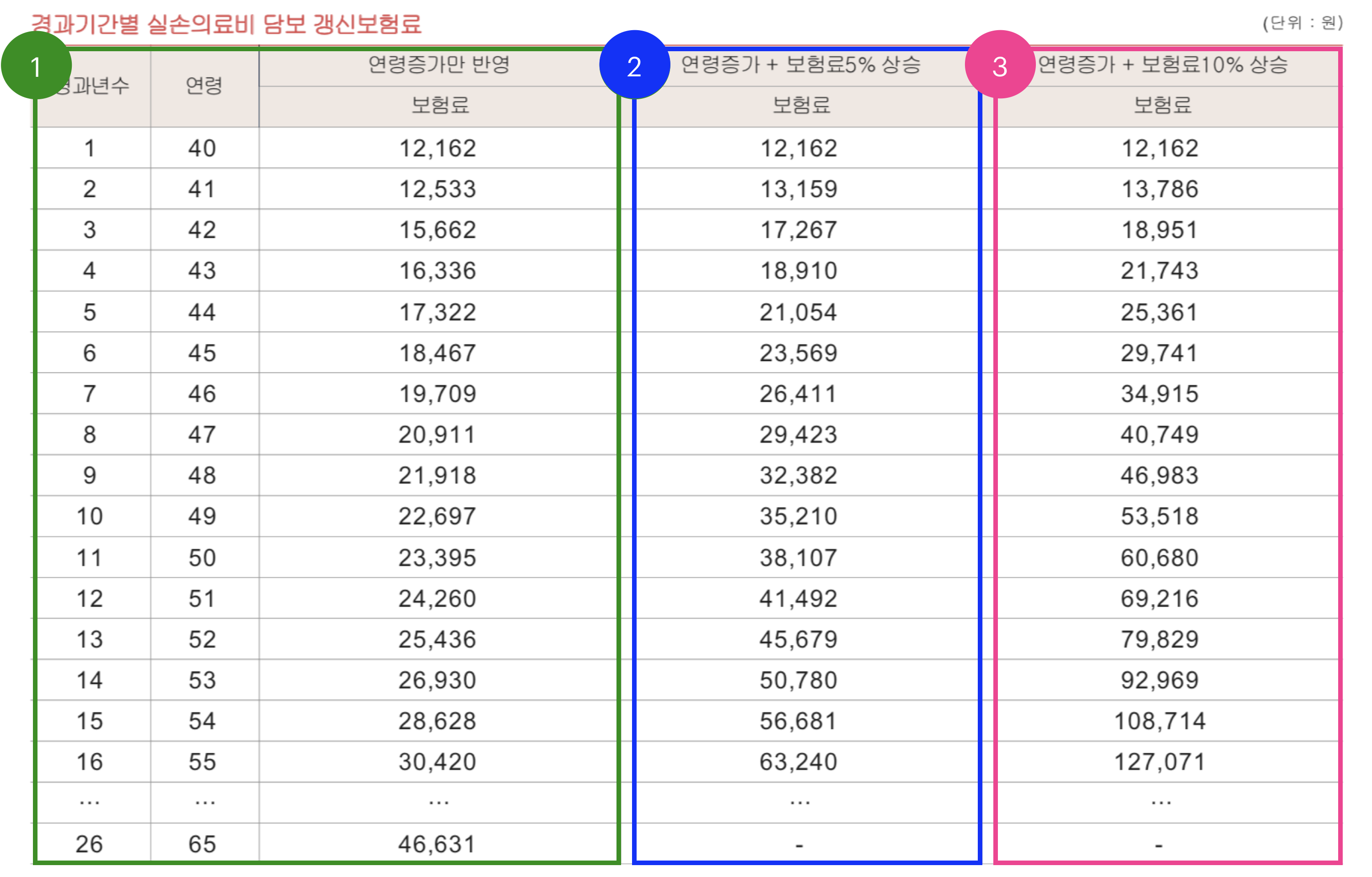 2009년 1세대 손해보험 추가 29세(여): 12,841원 => 51,410원(191.3% 인상) 2차 갱신 31세(남성): 11,776원 => 37,905원(167.7% 인상) 2차 갱신 56세(여) ) : 33,764원 => 114,776원(179%증가) 2차갱신 57세(남성) : 27,892원 => 90,399원(156%증가) 2차갱신