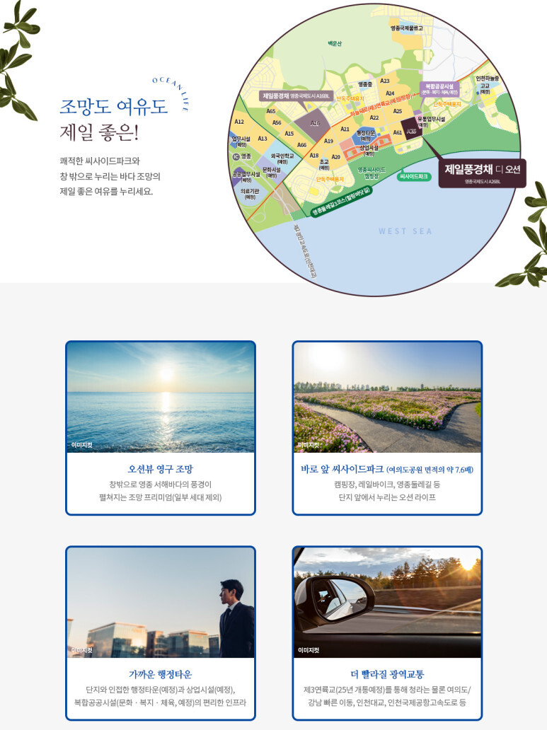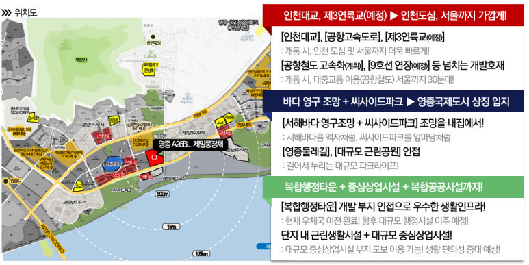 탁트인 바다조망 + 우수한 민자교통시스템 + 풍부한 개발혜택 -> 영종국제도시의 상징적 위치