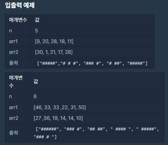 2. 각 매개변수 배열을 10진수에서 2진수(arr1, arr2)로 변환하여 벽과 간격을 찾습니다.